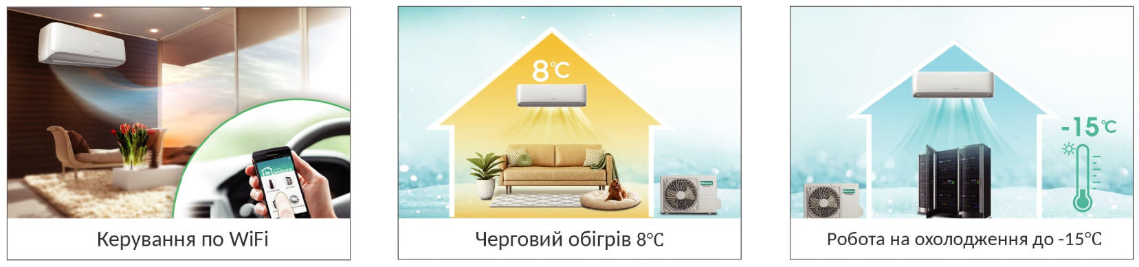 | Функції та особливості | Фукции Sleep, Smart, Super; Авторестарт; Dimmer; Quiet; Двойная шумоизоляция компрессора; WiFi ready; 4D воздушный поток – регулировка по вертикали и горизонтали с пульта; Таймер; Режим дежурного отопления +8C; Самоочистка; 7 скоростей вентилятора; I-Feel |