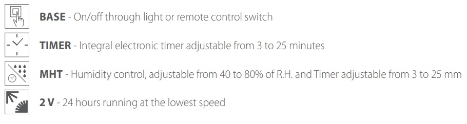 | Тип управління | Індивідуальний вимикач або вимикач освітлення, таймер затримки вимкнення і датчик вологості |